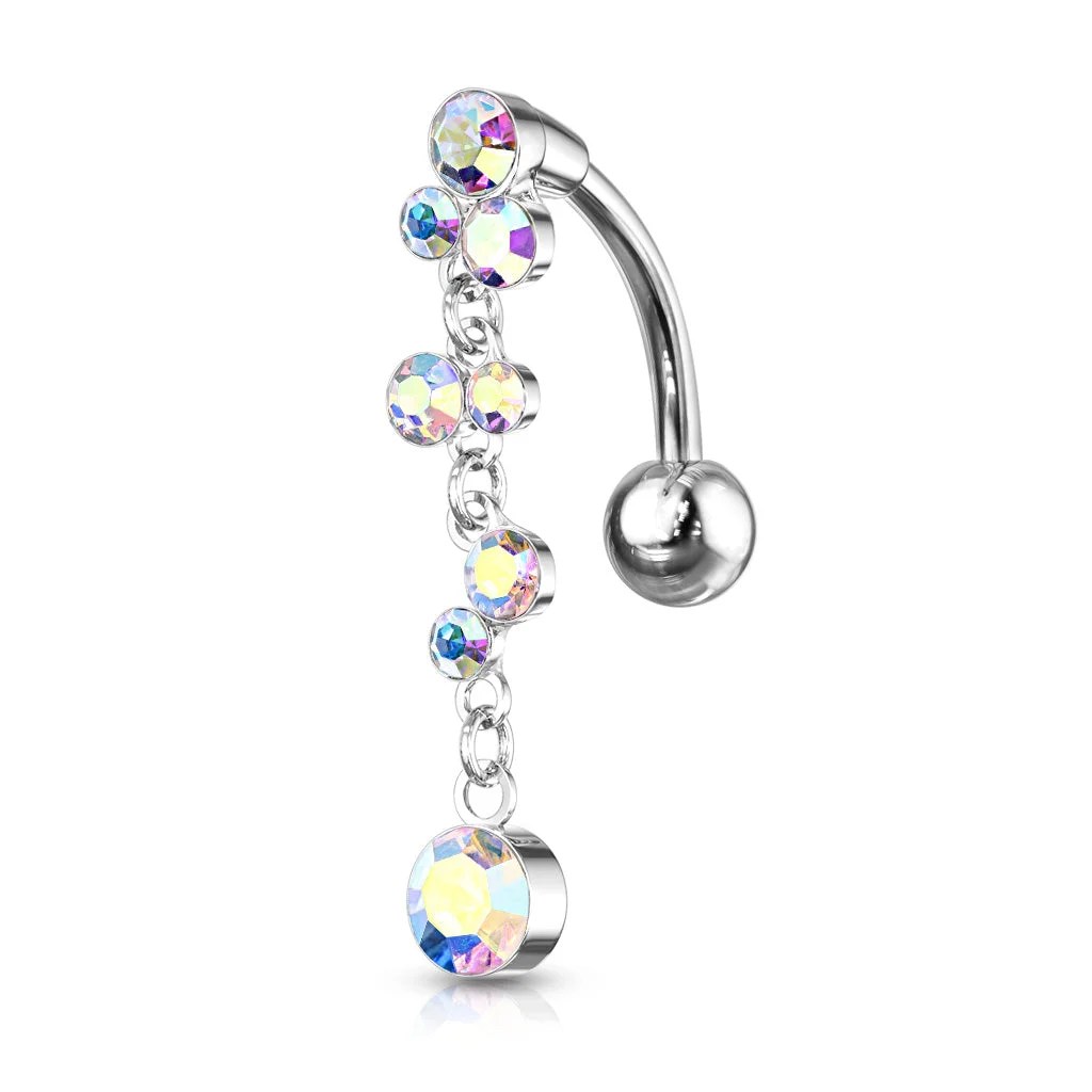 Clear cascading bubbles dangle beautifully from this top drop reverse style belly ring. 14 GA. 316L Surgical Steel material. 3/8″ barbell. Top down belly rings are a fun way to wear your favorite accessory!